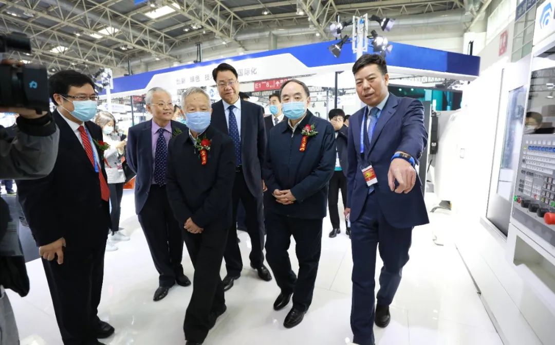 原教育部部長、中國工程院原院長、院士周濟,國務院派駐國有重點大型企業監事會原主席賈成炳,中國機床工具工業協會秘書長王黎明蒞臨公司展位。集團黨委書記、董事長嚴鑒鉑介紹集團智能機床產品相關情況。