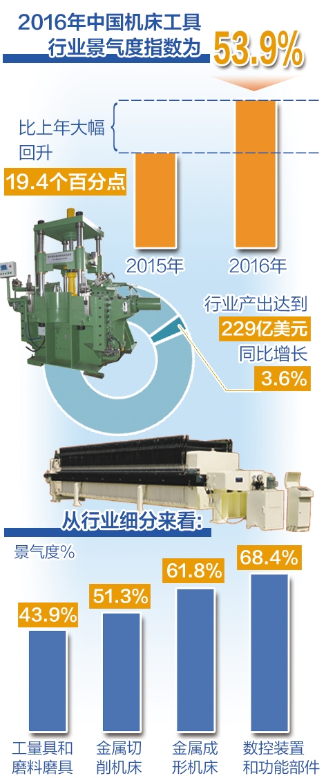 中國機床工具工業(yè)協(xié)會最新數(shù)據(jù)顯示,2016年中國機床工具行業(yè)景氣度指數(shù)為53.9%,比上年大幅回升19.4個百分點,反映出行業(yè)運行呈現(xiàn)回升態(tài)勢。